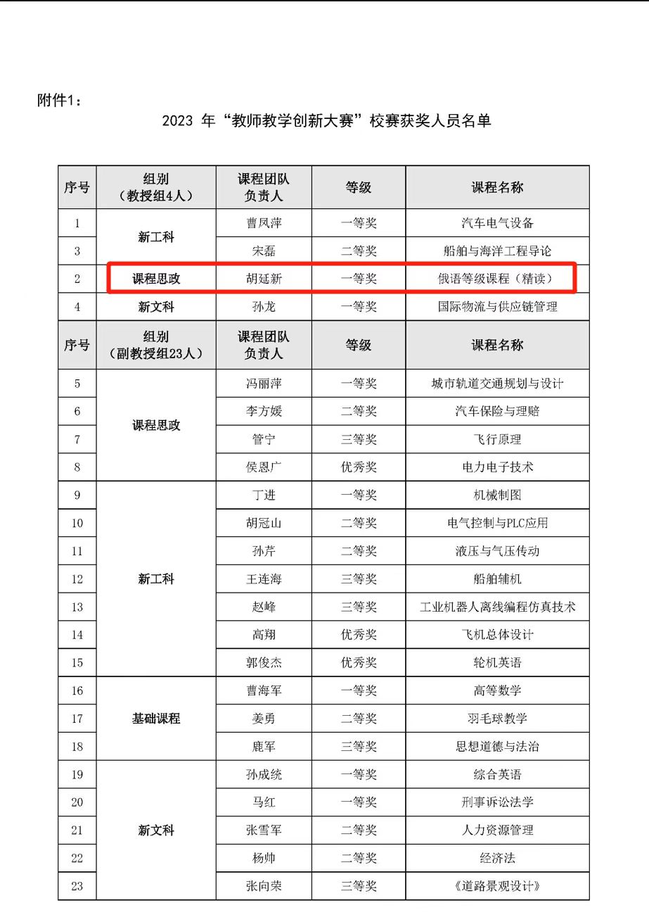 近日,2023年山东交通学院“教师教学创新大赛”落下帷幕,经过学院积极组织参赛、平台报名申报、专家评审等环节,我院胡延新教授的《俄语等级课程(精读)》在比赛中脱颖而出,在教授组中获得课程思政类别一等奖,并将代表山东交通学院参加2023 年山东省普通高等学校教师教学创新大赛。