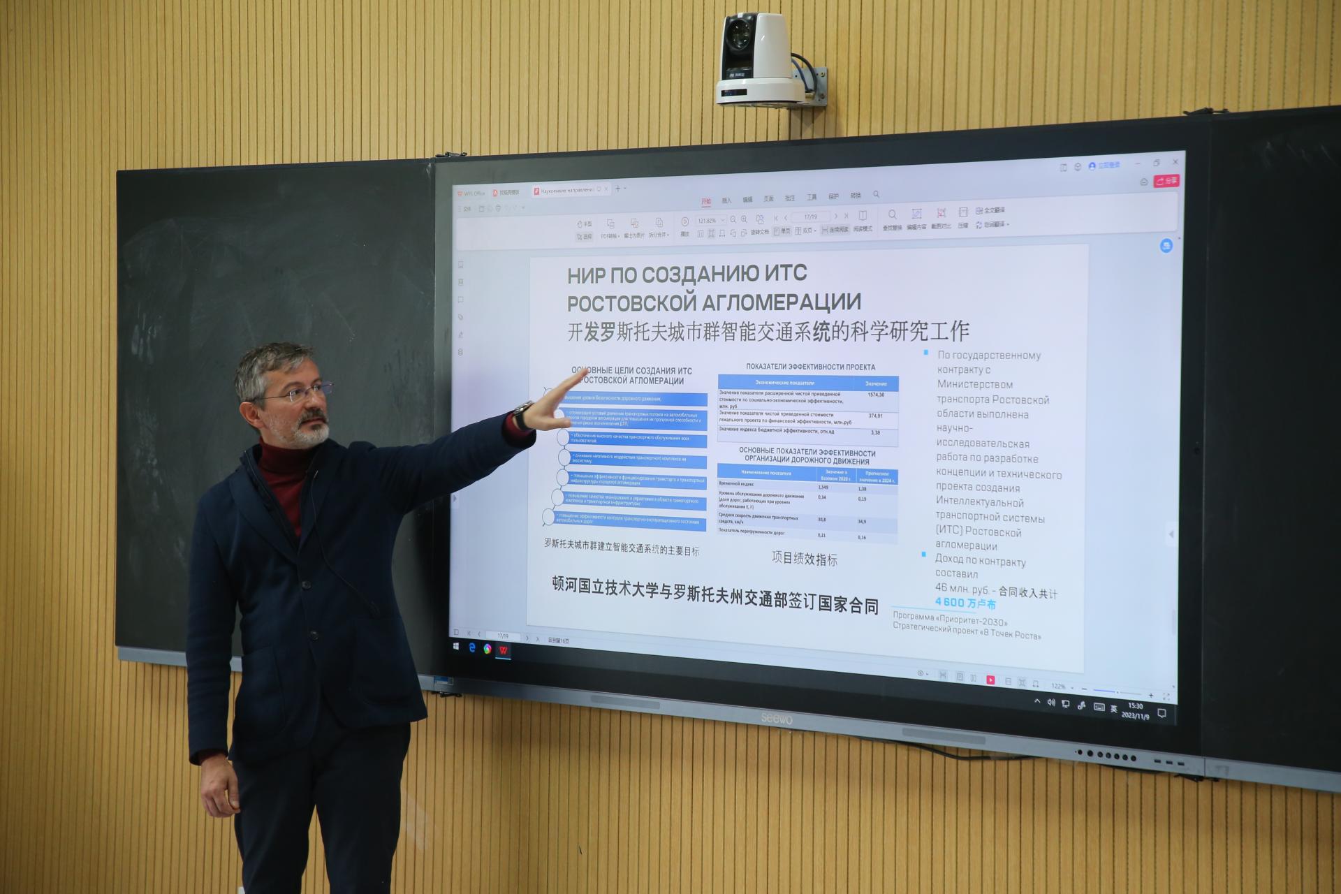 为进一步增强学生学术能力,提升专业教师科研水平,营造国际化办学氛围,11月9日,我院俄方合作院校顿河国立技术大学道路交通学院院长、俄罗斯交通运输领域专家多比林·伊万·弗拉基米罗维奇教授为我院交通运输专业师生做了题为“交通运输发展研究趋势”的学术报告。这是俄方专家疫情后第一次与中方师生面对面开展学术交流,也是顿河专家论坛第一期讲座。交通运输教研室主任、专业教师、研究生和20、21级本科生共计100余人参加了讲座。