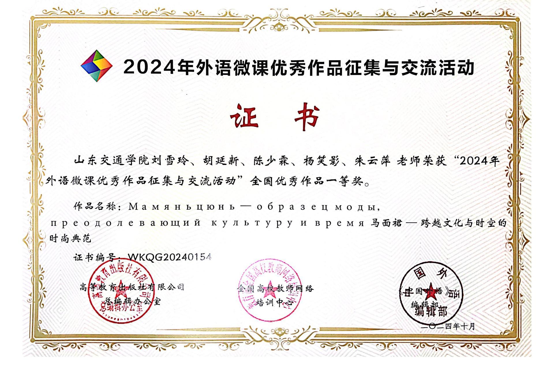 近日, 由高等教育出版社、全国高校教师网络培训中心与《中国外语》编辑部联合主办的“2024年外语微课优秀作品征集与交流活动”落下帷幕,我院刘雪玲教师团队凭借参赛作品《马面裙——跨越文化与时空的时尚典范》荣获本科俄语组全国一等奖,这是我院首次在该赛事中获得国家级一等奖,标志着我院在外语课程教学与数字化融合领域取得了重要突破。