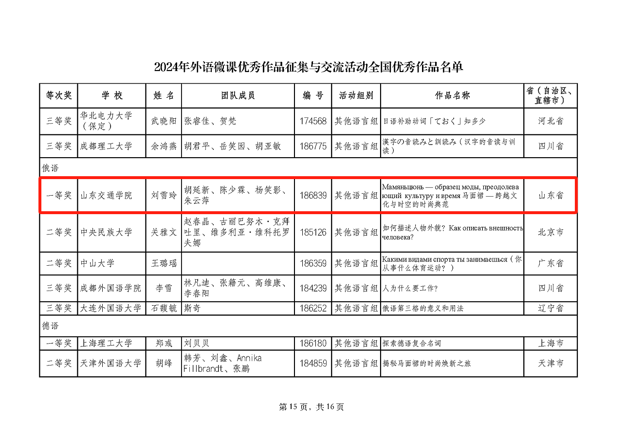 本次活动自今年4月启动,历时半年,吸引了包括中国石油大学、中央民族大学、武汉大学、大连外国语大学、成都外国语大学在内的全国29个省(自治区、直辖市)509所院校的3755名教师参赛。此前刘雪玲教师团队的微课作品在山东省赛区脱颖而出,荣获其他语言组山东省优秀作品一等奖,成功晋级全国决赛。最终,该作品凭借创新的课程设计和优秀的教学效果,以最优成绩荣获全国优秀作品一等奖,充分展现了我院教师在课程设计和教学实践中的专业水平和创新能力。