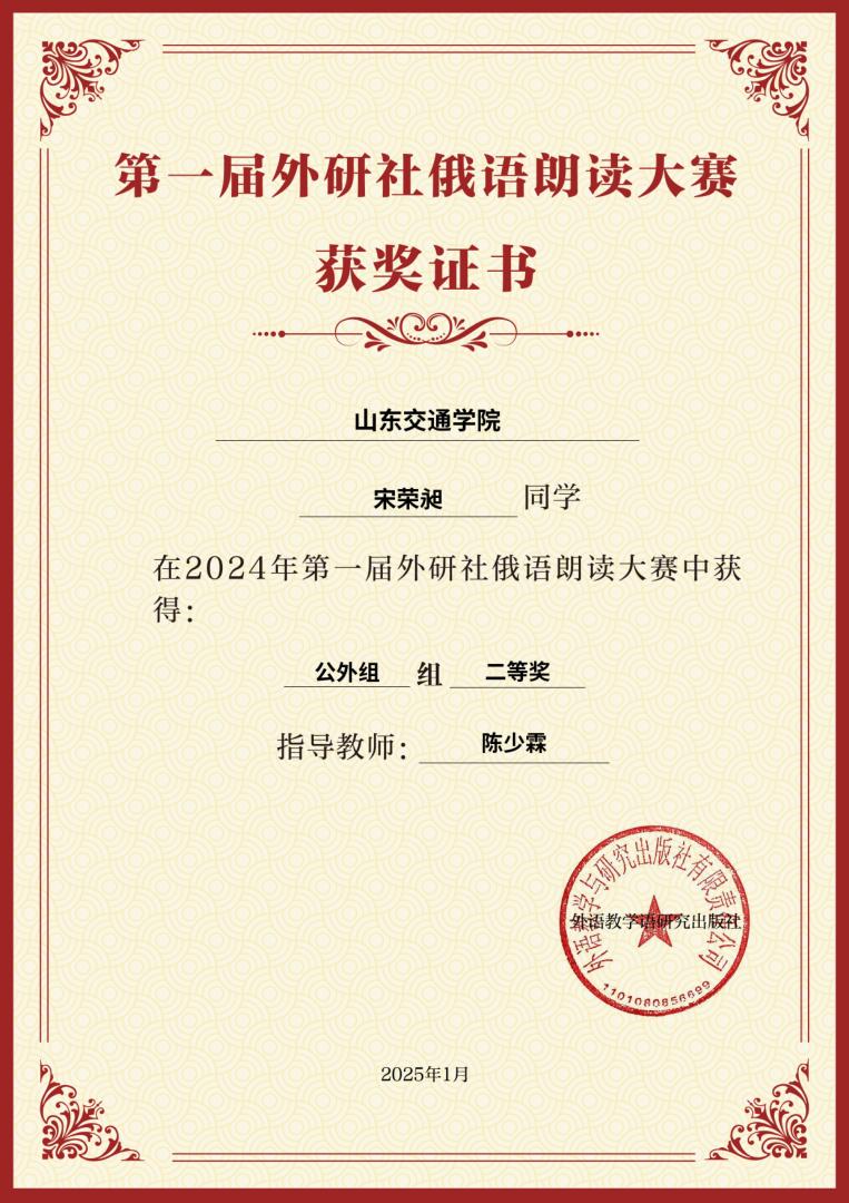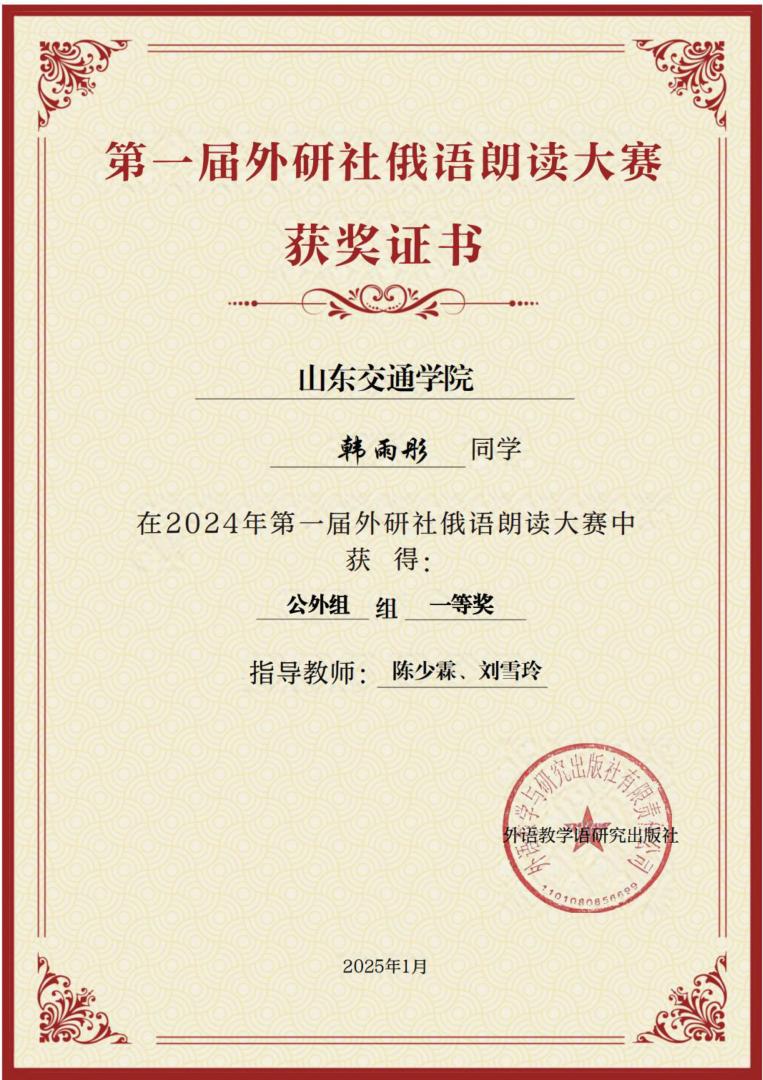 近日,全国首届外研社俄语朗读大赛圆满落幕,我院学子韩雨彤凭借扎实的语言功底与生动的舞台表达,在激烈角逐中脱颖而出,荣获公外组全国一等奖,宋荣昶荣获公外组全国二等奖,展现了我院学生卓越的语言素养与综合能力。我校成为唯一一所同时获得全国一、二等奖的高校。