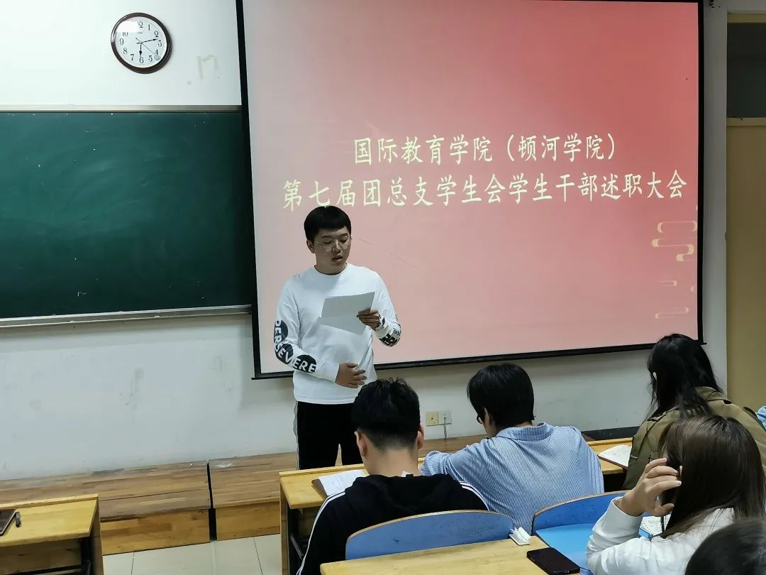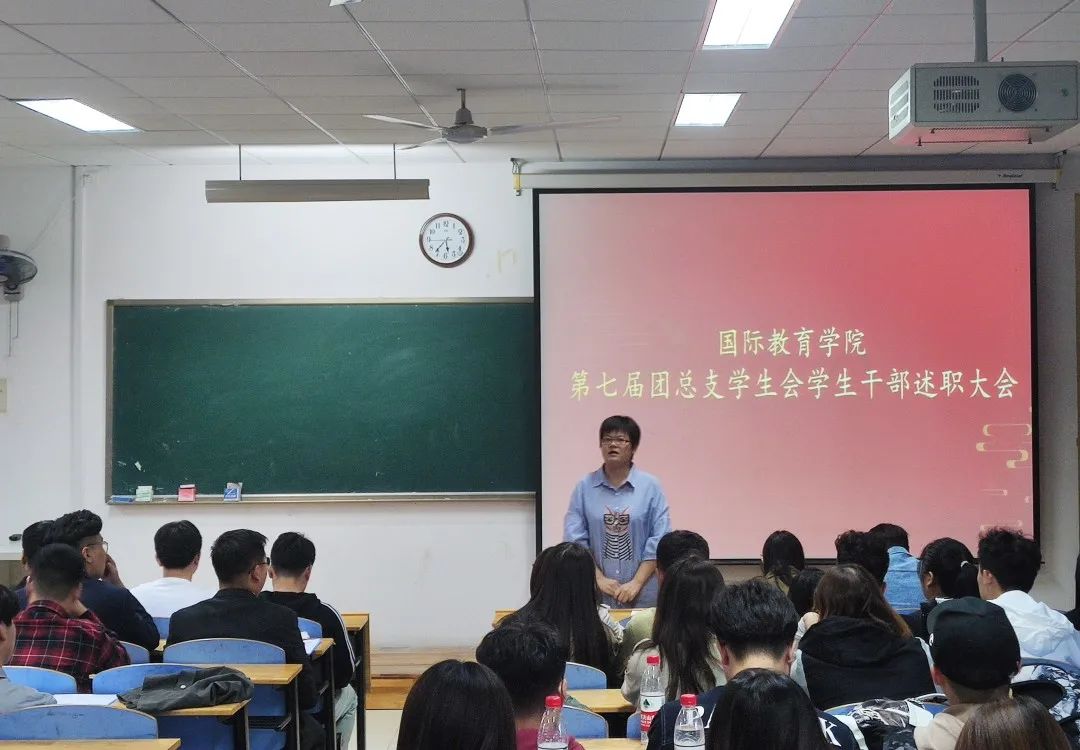 2020年10月5日晚,国际教育学院第七届团总支、学生会学生干部述职大会在长清校区2C501举行。学院团总支书记王伟、辅导员刘宇、马柳欣慰出席了会议,大会由团总支副书记亓震主持。