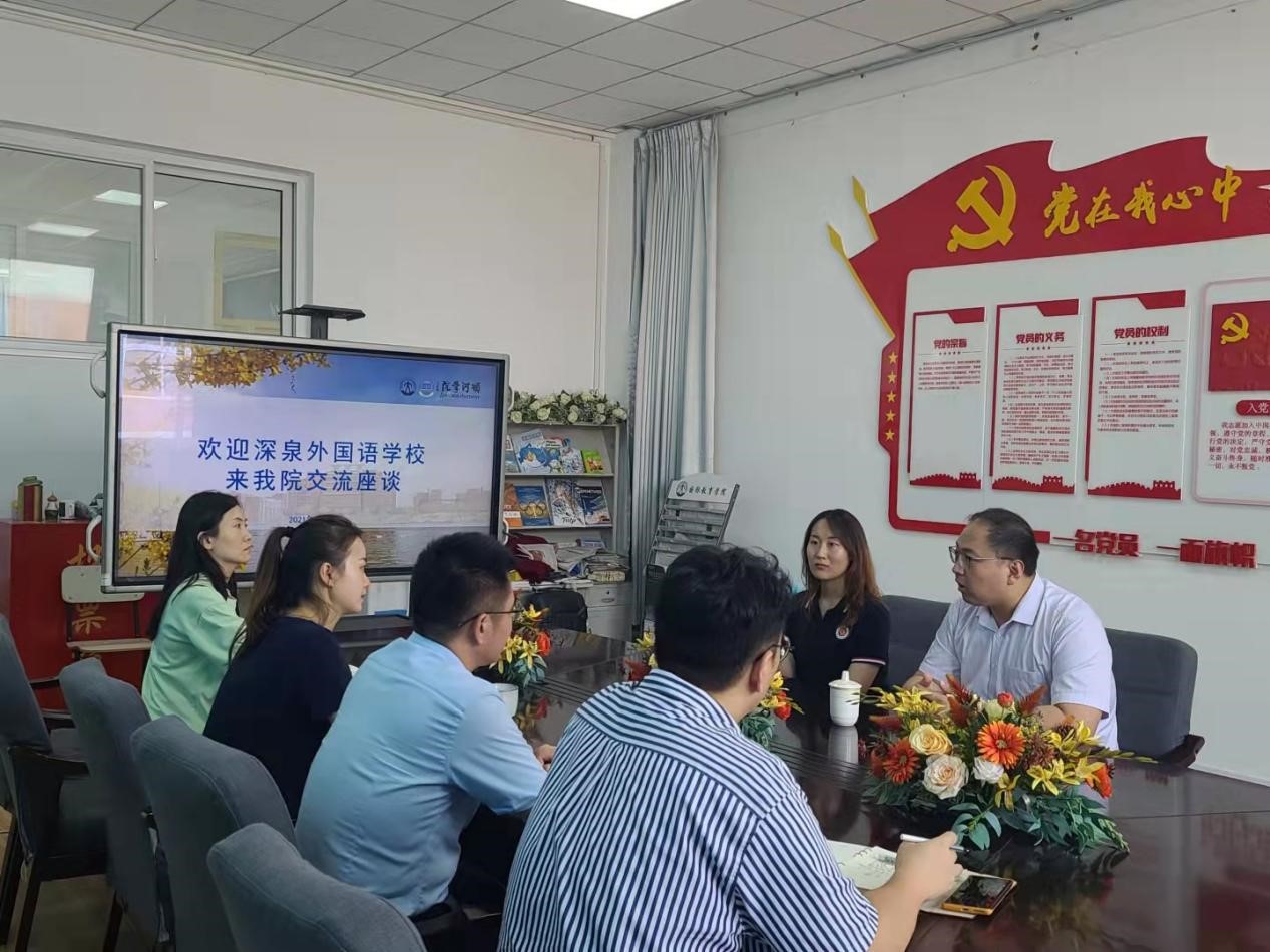 会上,刘春光对深泉外国语学院校的到访表示了热烈欢迎,对学院中外合作办学项目与机构运行、来华留学生的日常管理与教育,学院师资力量和专业课建设等情况进行了介绍,并重点就学院发展历史和学生发展目标规划做了说明。他表示,学校不仅是传授学生知识的殿堂,更是要履行社会服务的职能。要精益求精做好教育教学,将学生职业生涯规划和学历提升目标相结合,形成具有良好实操性的闭环,真正做到让学生安心家长放心。希望今后与深泉外国语学校加强沟通交流,共同探索教育教学服务新方法。
