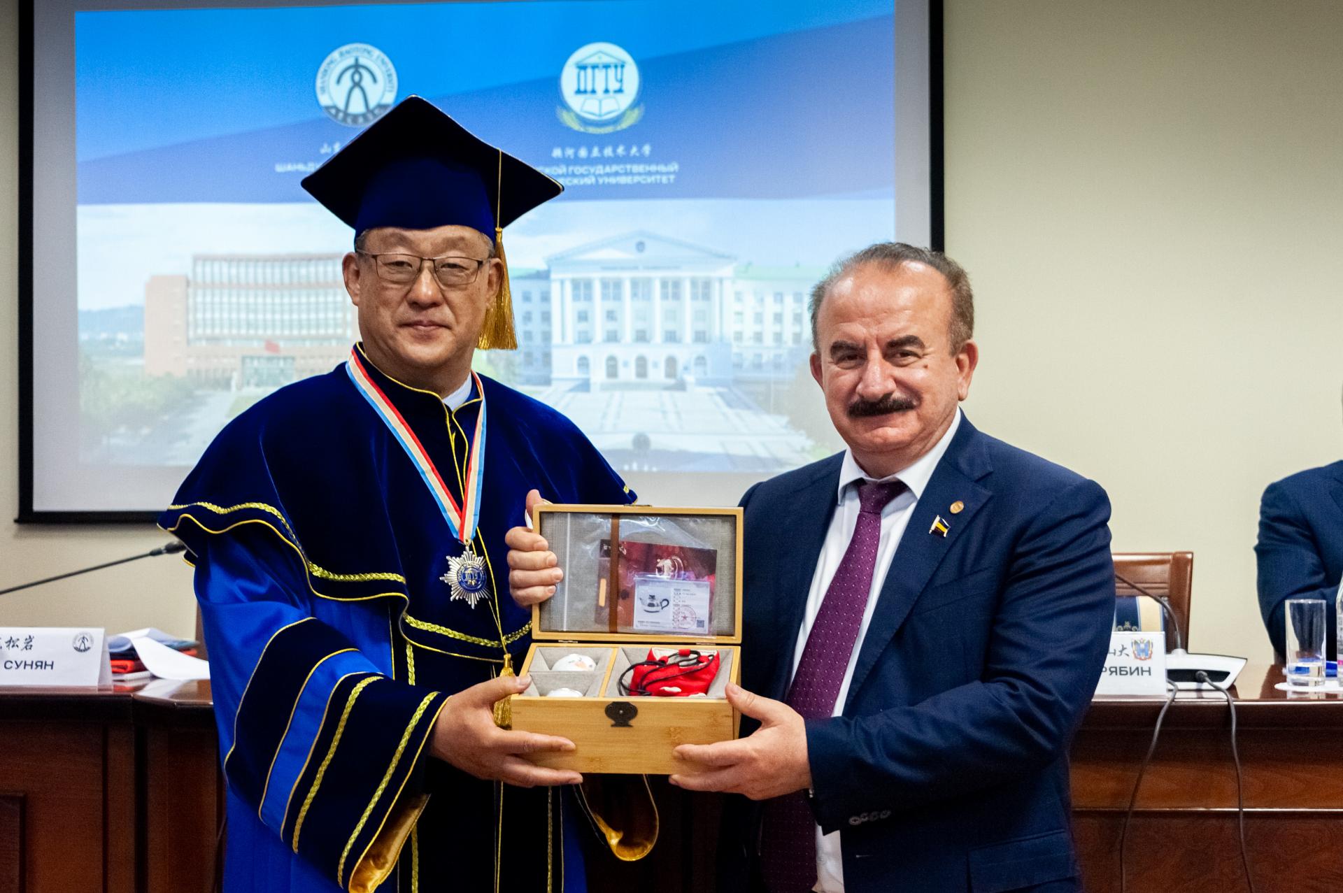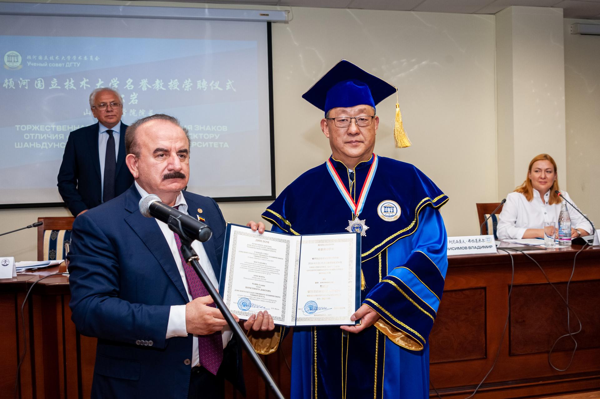 在欢迎仪式中,学术委员会主席弗拉基米尔·阿尼西莫夫宣读了《顿河国立技术大学学术委员会授予陈松岩名誉博士称号的决议》,梅什西校长向陈松岩校长颁发顿河国立技术大学“名誉博士”证书,以表彰其在发展国际合作和高水平人才培养及共建中外合作办学机构中做出的贡献。据悉,被授予顿河国立技术大学名誉博士的还有俄罗斯联邦现任外交部部长谢尔盖·拉夫罗夫、格鲁吉亚科学院主席格奥尔基·科维谢塔兹等。