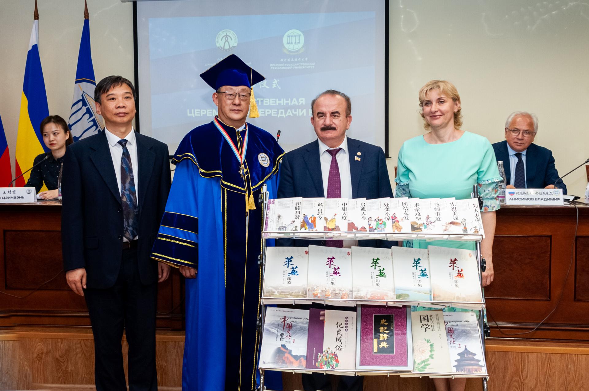陈松岩校长代表山东交通学院向顿河国立技术大学赠送图书200余册,图书涵盖中国文化、历史、艺术、汉语等主题,下一步,两校将继续在汉语国际教育领域开展合作,深化文明交流互鉴,推动中华文化更好走向世界。