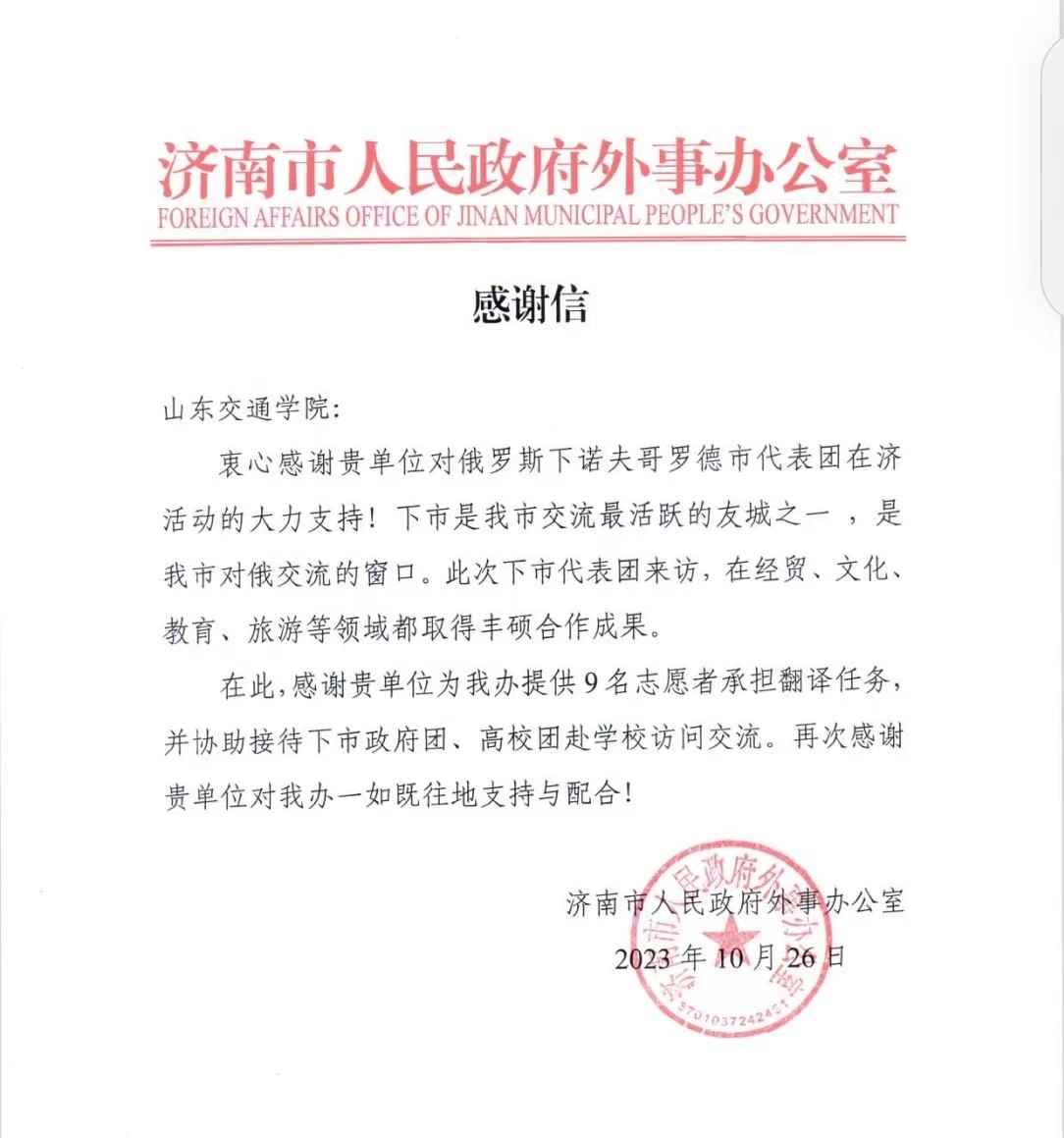 近日,国际教育学院收到来自济南市人民政府外事办公室发来的感谢信。信中对我院积极对接下诺夫哥罗德市政府团、高校团来我校交流座谈表示感谢,对顿河学院郑璐等9名师生在下诺夫哥罗德市代表团访济期间,承担两市市长座谈交流会及两市商贸企业对接中承担的翻译工作表示了充分肯定和诚挚谢意。