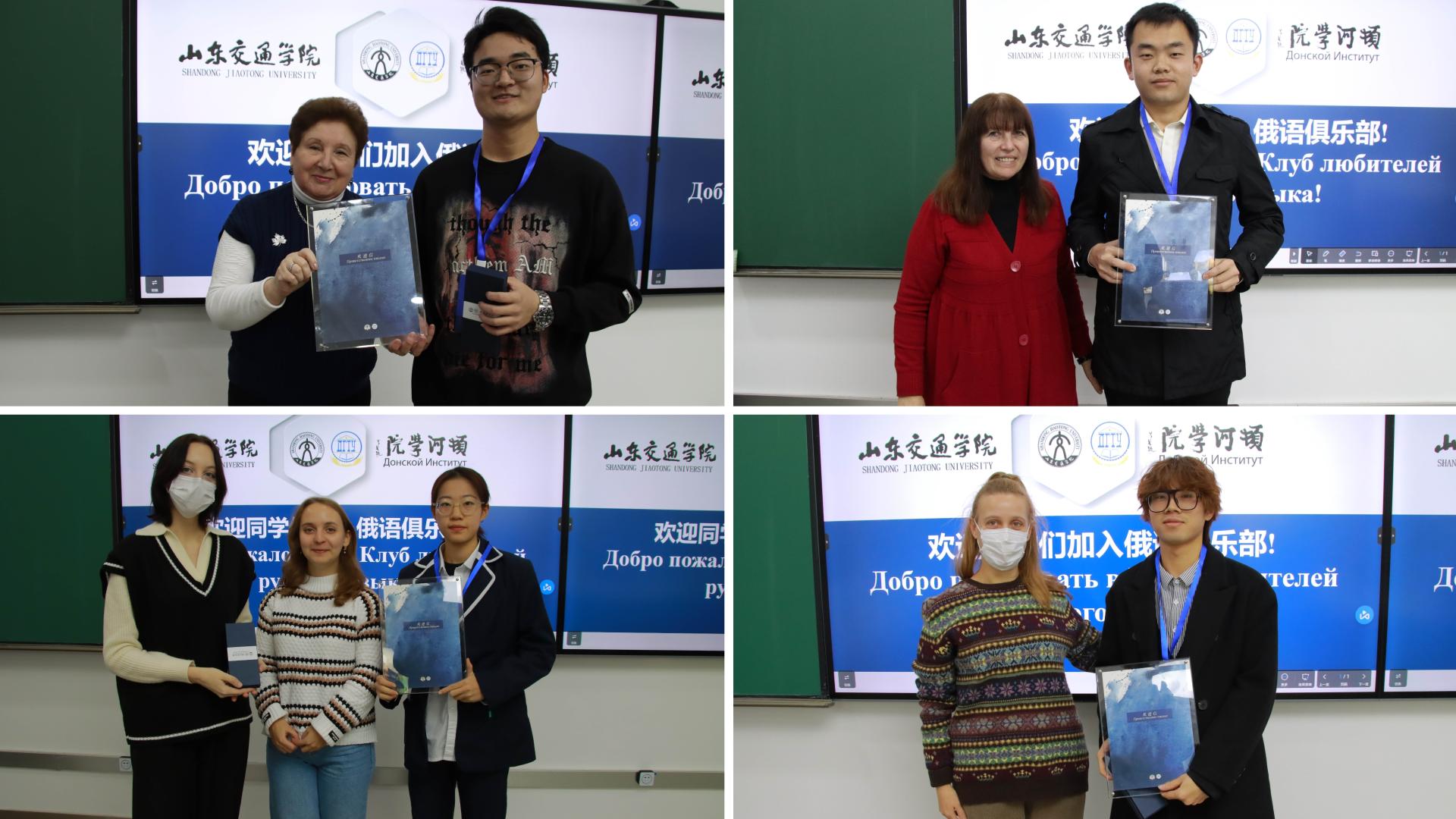 对外俄语教研室外教老师们为俄语俱乐部成员颁发了俱乐部成员证、欢迎信等。