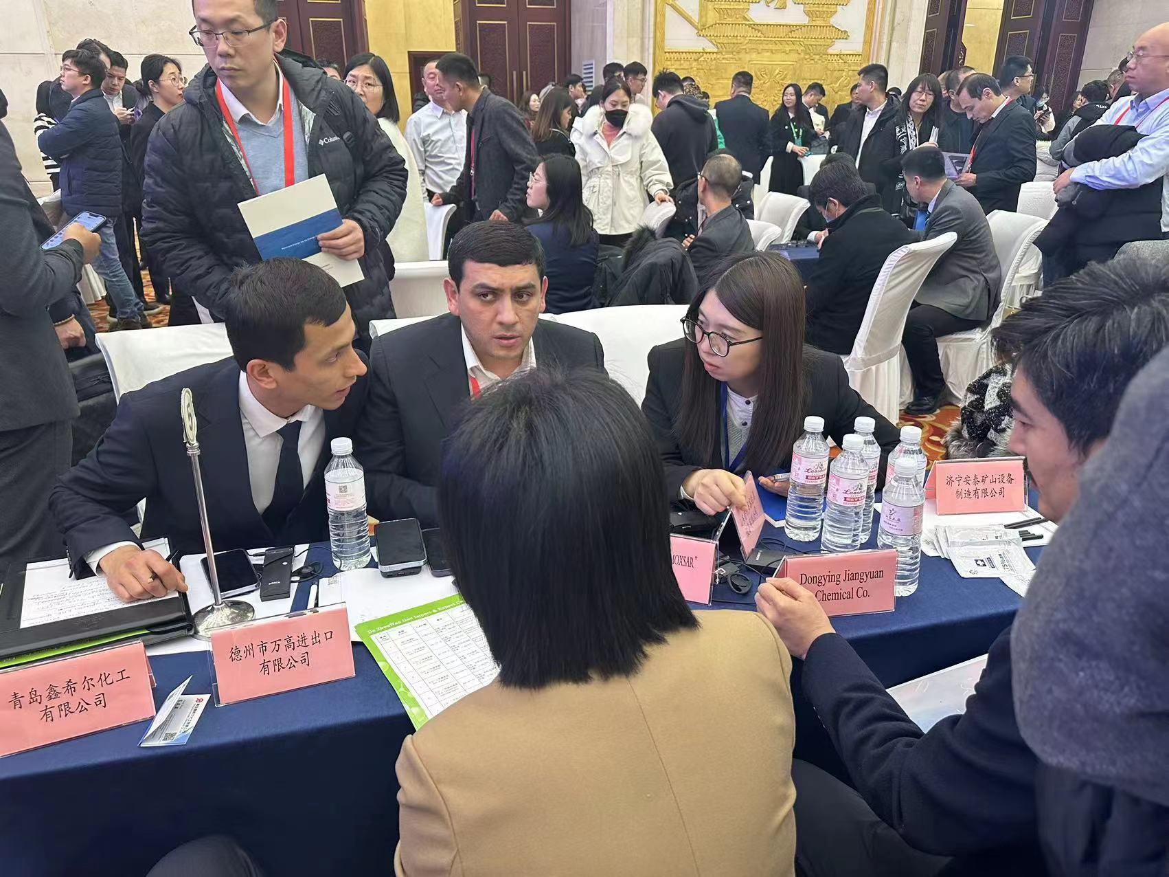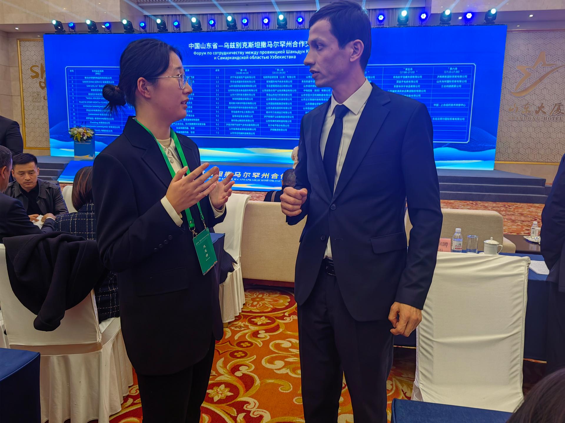 我院师生在“中国山东省—乌兹别克斯坦撒马尔罕州合作交流会”上为中乌双方企业对接洽谈提供交传翻译,为推动两省州在经贸等领域深化合作贡献力量。