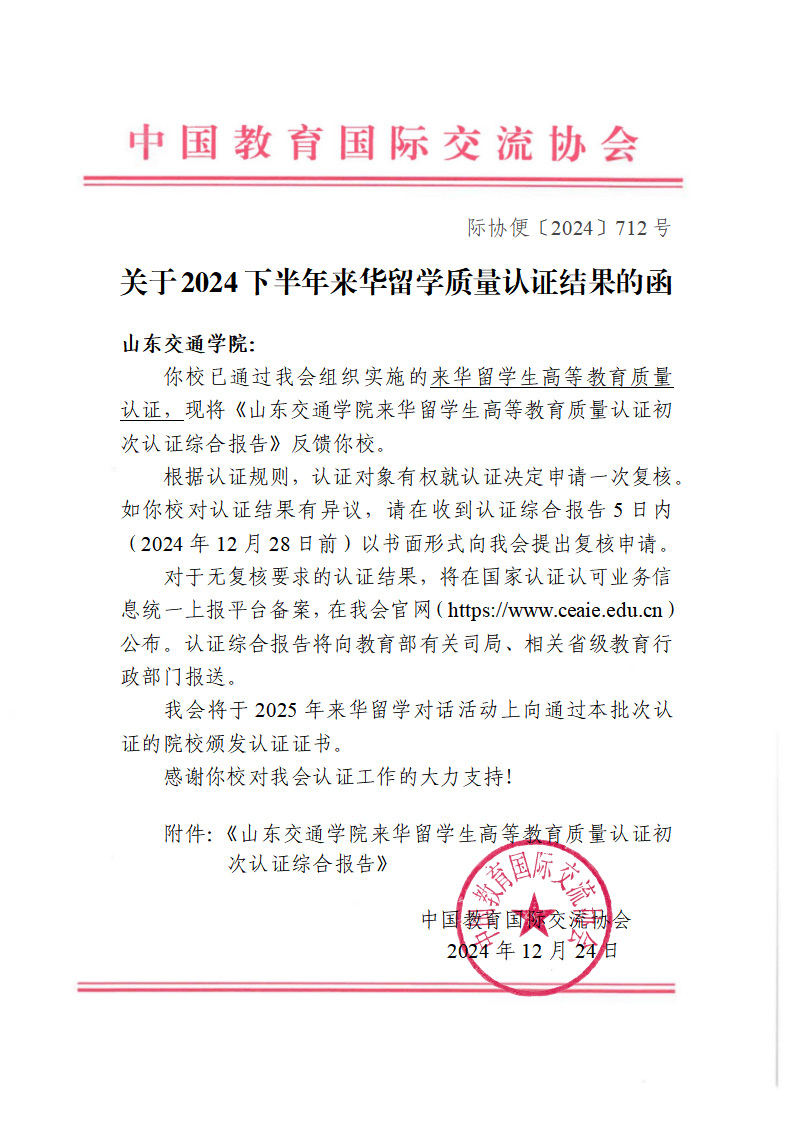 近日,中国教育国际交流协会来函,我校顺利通过来华留学生高等教育质量认证,获得4年认证有效期。
