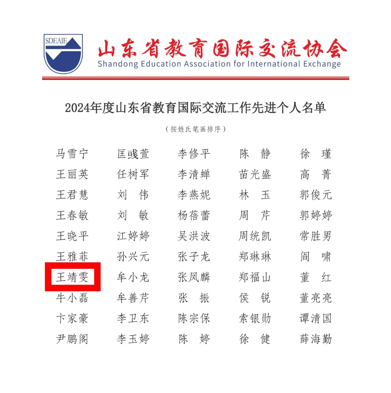 近日,《关于表彰2024年度山东省教育国际交流工作先进单位及先进个人的决定》文件公布,我院教师王靖雯荣获“山东省教育国际交流工作先进个人”称号。
