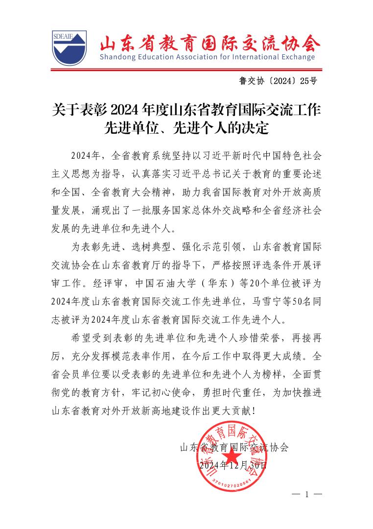 本次评选由山东省教育厅指导,山东省教育国际交流协会组织开展,旨在表彰推动山东教育国际交流合作、助力我省教育对外开放高质量发展作出突出贡献的个人,全省共50人获评“山东省教育国际交流先进个人”。