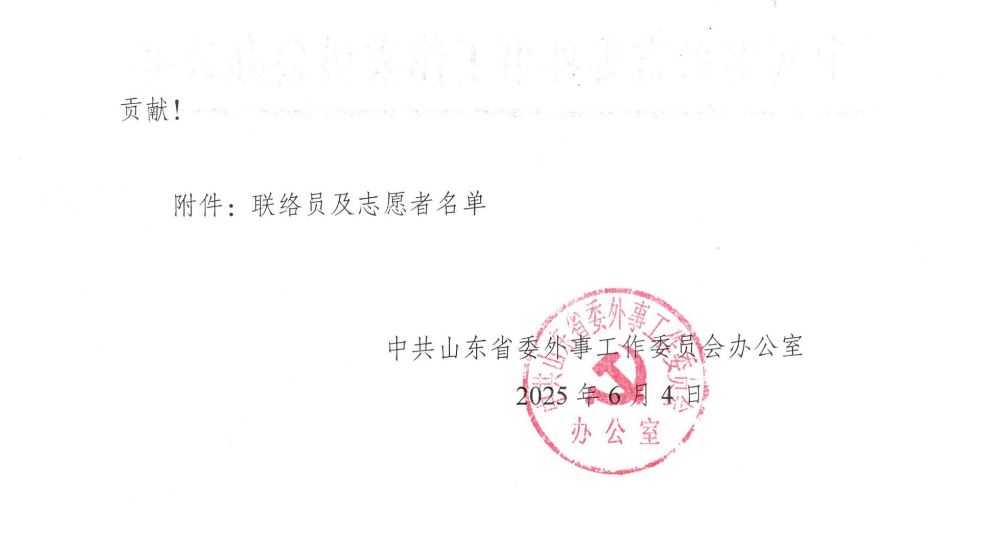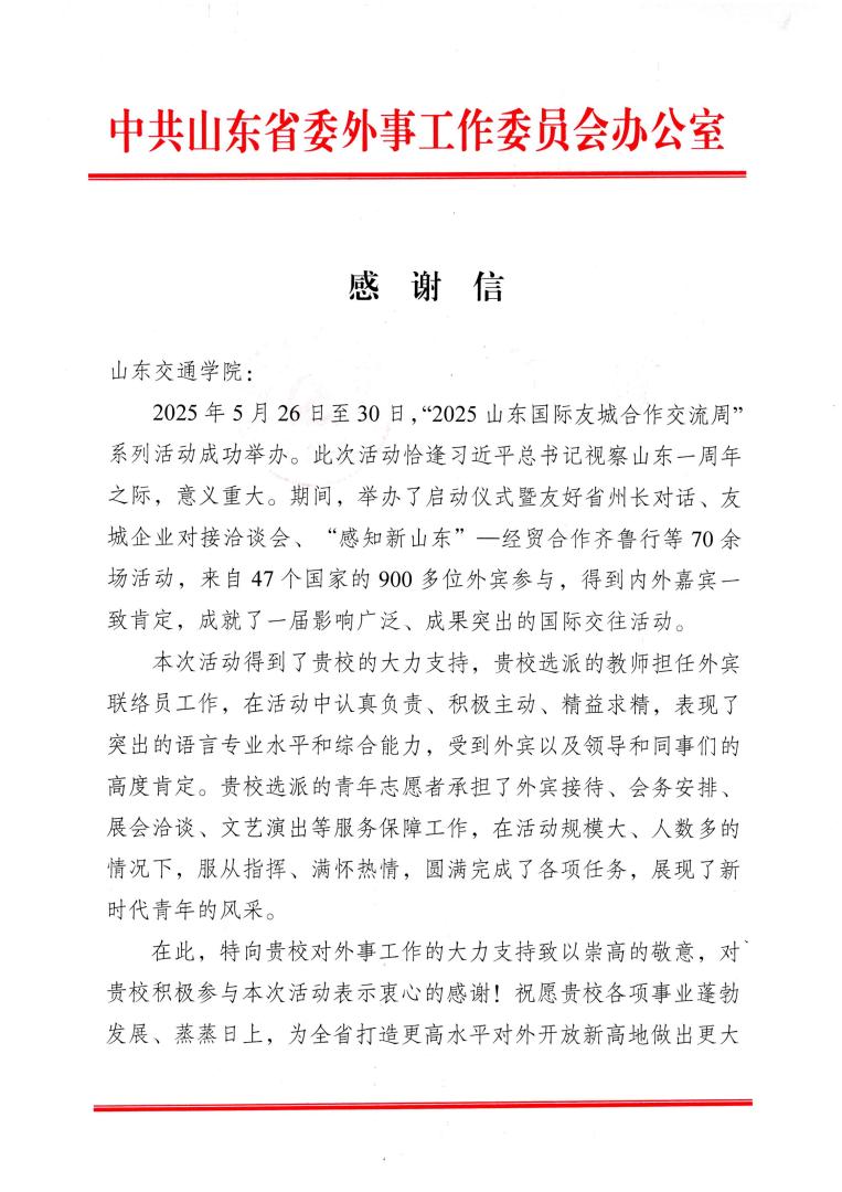 近日,中共山东省委外事工作委员会办公室向我院发来感谢信,对我院师生外事服务团队在“2025山东国际友城合作交流周”系列活动中提供翻译和志愿服务表示感谢。信中高度评价了师生志愿者在本次活动中的优异表现,赞扬了师生们在活动期间展现出的语言专业水平以及热情务实的工作作风,为大会的成功举办提供了有力保障,受到了中外嘉宾和领导的一致好评。